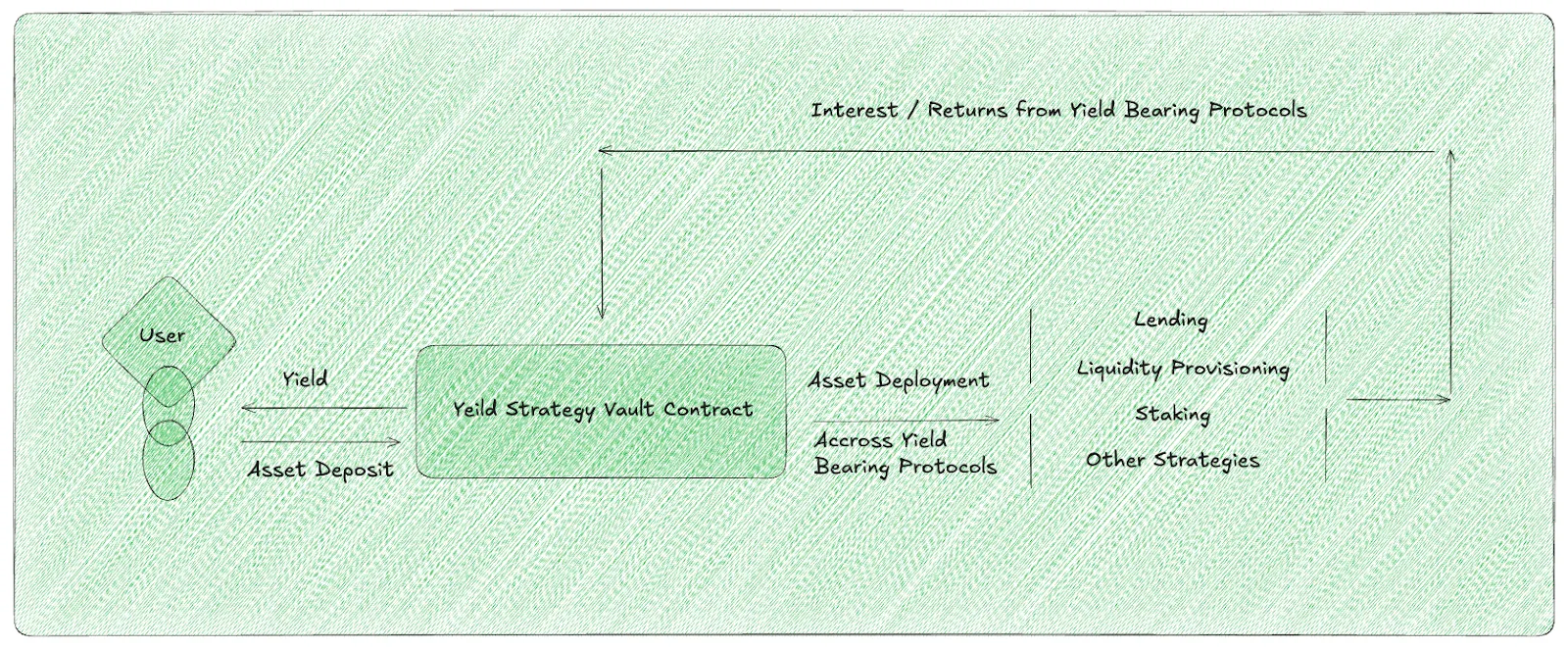 수익 창출형 볼트는 사용자가 ERC-20 토큰을 공용 풀(Pool)에 예치하고, 그에 대한 비례적 소유권을 나타내는 수취 토큰을 받도록 합니다. 이 수취 토큰은 사용자의 볼트 지분을 추적하며, 나중에 원금과 누적된 수익을 합친 자산으로 상환할 수 있습니다.