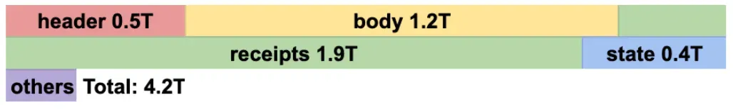 Block data — headers, transaction bodies, receipts — makes up over 3.6TB. This data must be retained. The node needs it to verify old transactions and answer queries.