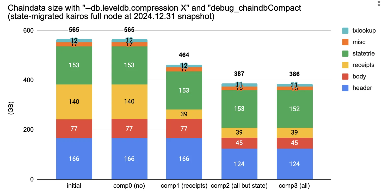 Kaia uses Google’s LevelDB for storage, which has built-in compression. But it wasn’t turned on by default. All those repetitive zeros sat there taking up space.