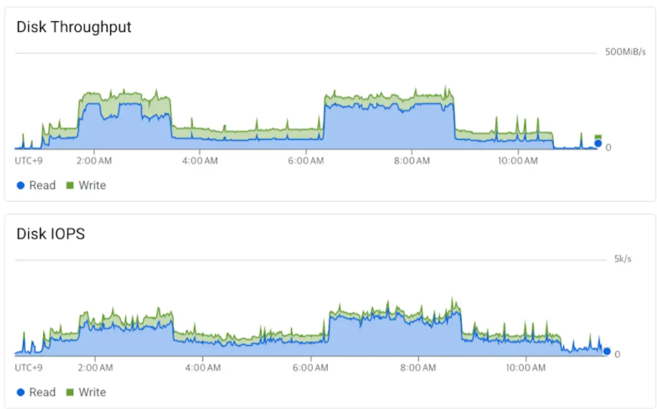 Disk throughput peaks above 200 MiB/s for reads and 250 MiB/s for writes, while IOPS frequently exceeds 2,000 operations per second.