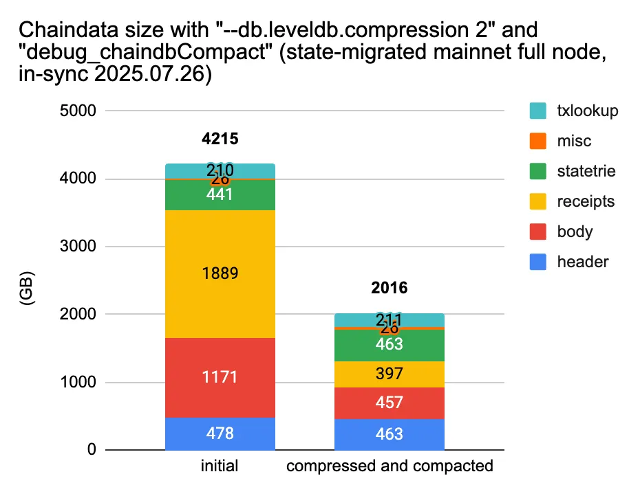 메인넷 풀 노드에서 압축과 수동 압축을 병행했고 용량 감소 효과는 상당했습니다.