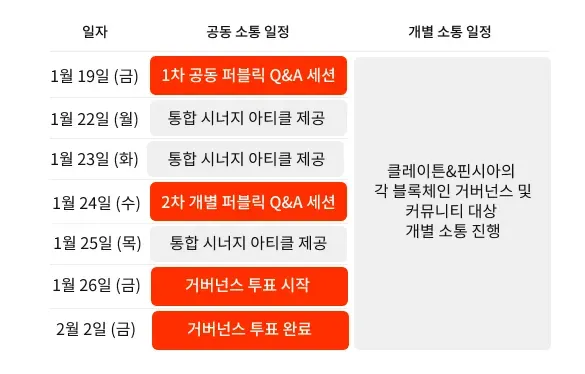 이번 통합건은 양 블록체인의 새로운 성장과 아시아 Web3 시장에 변화를 만들기 위한 매우 중요한 안건이라고 생각합니다. 그리고 핀시아와 클레이튼의 각 거버넌스 참가사들과 커뮤니티의 다양한 의견을 청취하고 결정하는 것이 반드시 필요하다고 생각합니다. 따라서 투표 전까지 각 거버넌스 참가사들과 커뮤니티에서는 많은 의견을 지속적으로 개진해주시길 부탁드립니다.