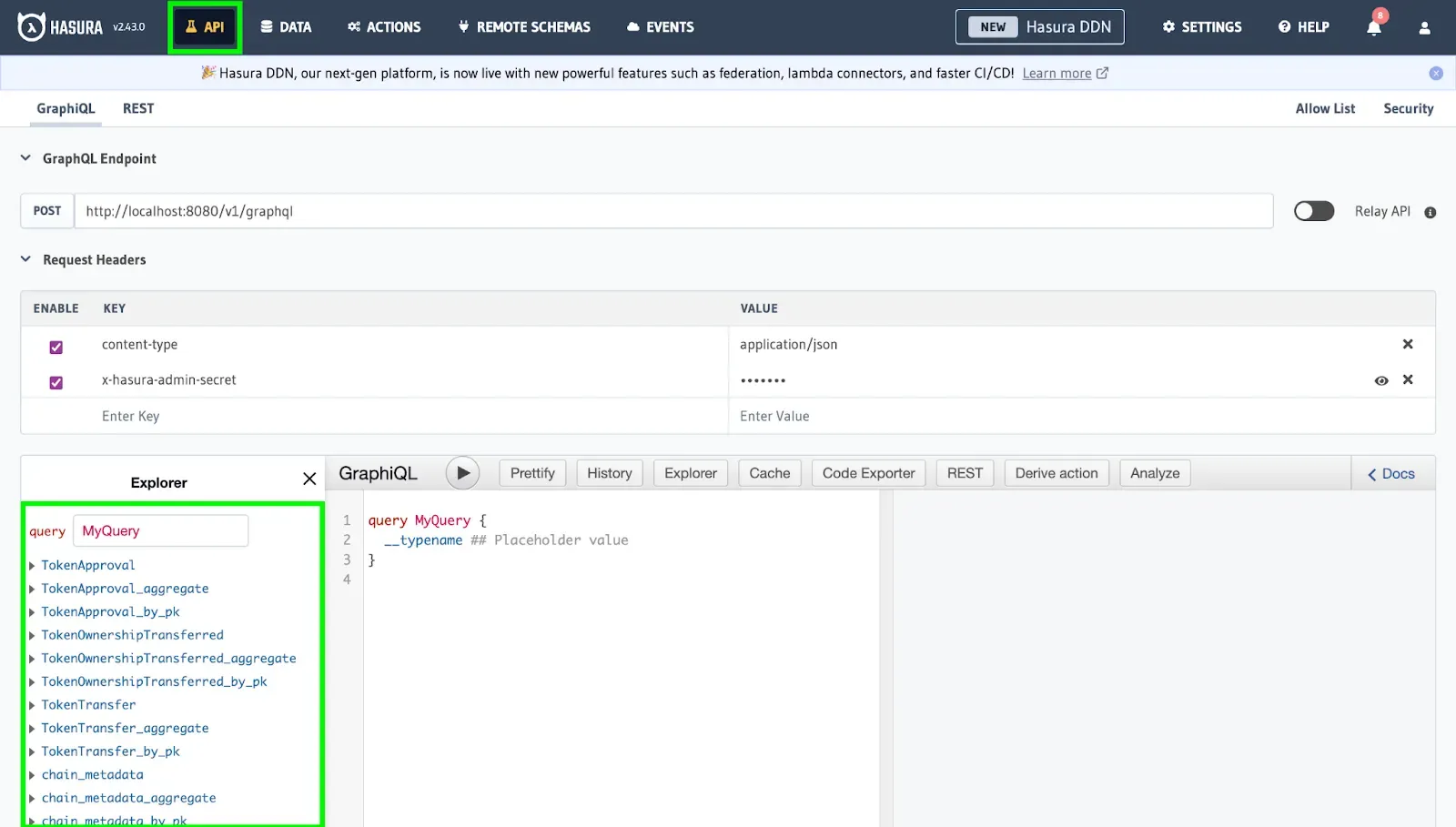 - http://localhost:8080/에서 제공되는 Hasura Console로 이동하여 admin-secret 비밀번호(“testing”)를 입력하고, 상단 열에서 “API”를 클릭하여 실시간 데이터를 쿼리할 수 있는 GraphQL 엔드포인트에 접근하세요.
