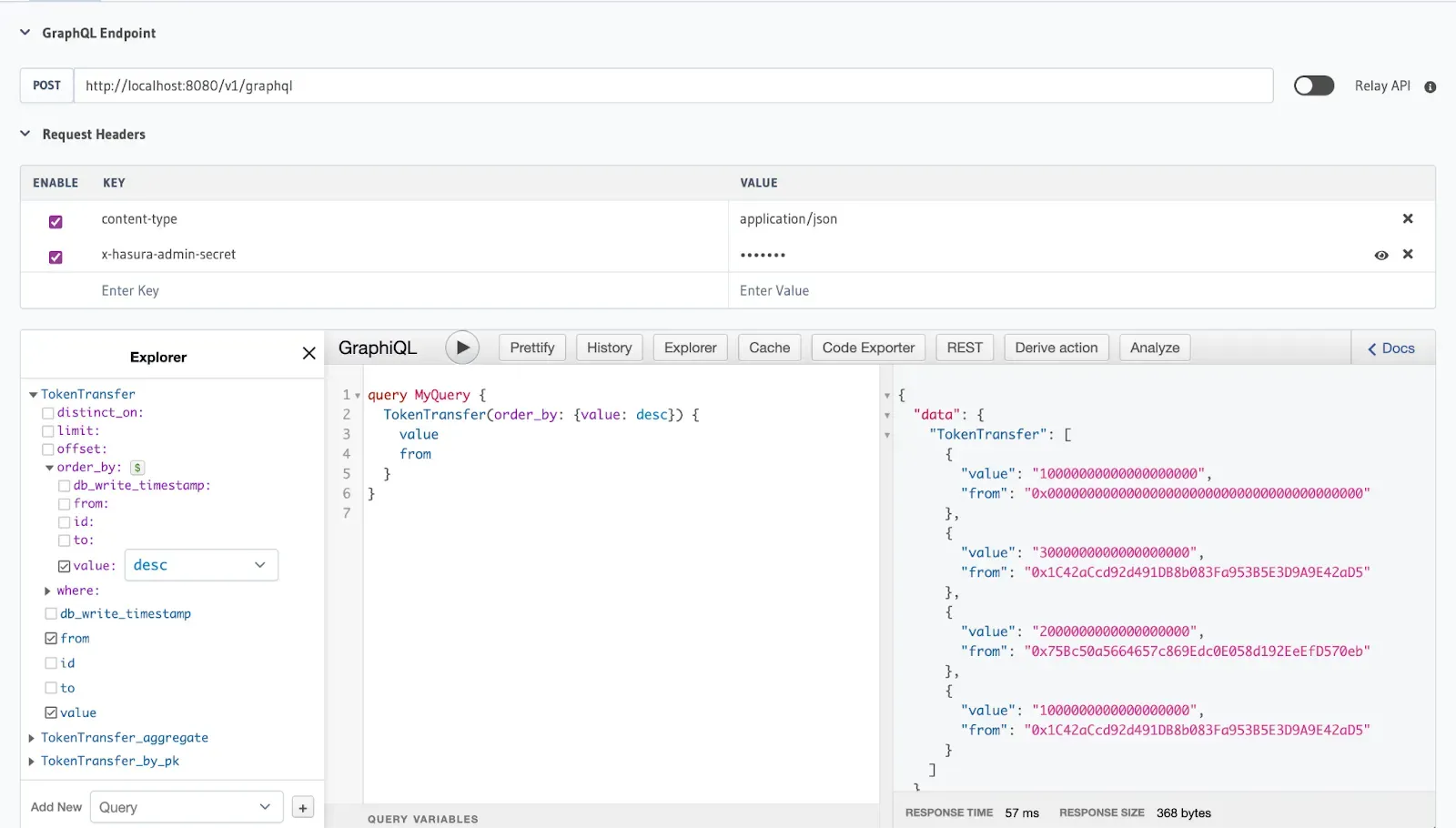 이제 TokenTransfer 이벤트를 쿼리하여 금액, 송신자, 수신자, 그리고 가치 등의 세부 정보를 살펴보겠습니다. 이 가이드에서는 우리가 먼저 보고 싶은 금액 순서로 쿼리를 정렬할 것입니다(이 경우: desc = 가장 큰 금액), 누구로부터 온 것인지, 그리고 전송되는 가치를 기준으로 정렬하겠습니다.