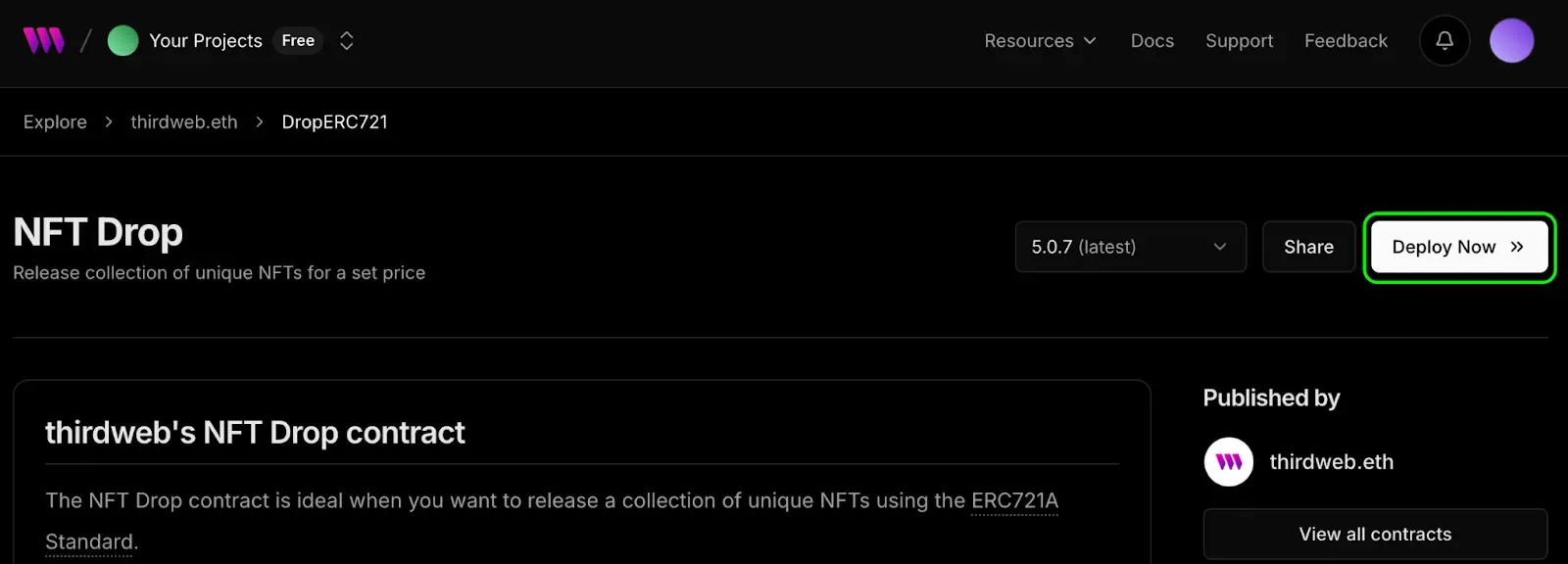 In this section we will deploy an NFT drop contract using the thirdweb dashboard. This contract allows players to claim an NFT having fulfilled the claim condition set by the creator of the NFT. We would create and deploy the NFT drop contracts in the following steps: