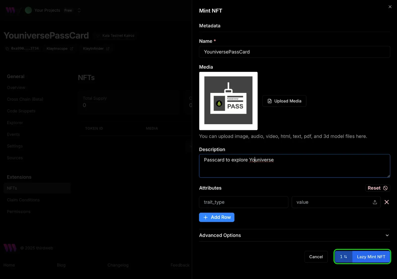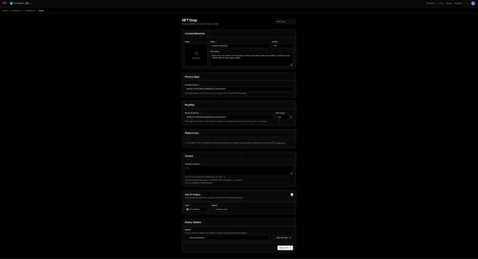 - Fill in the contract parameters such as NAME (YouniversePassCard), SYMBOL (YPC), Description etc, configure the chain (Kaia Testnet Kairos) you want to deploy to and hit the Deploy Now button.