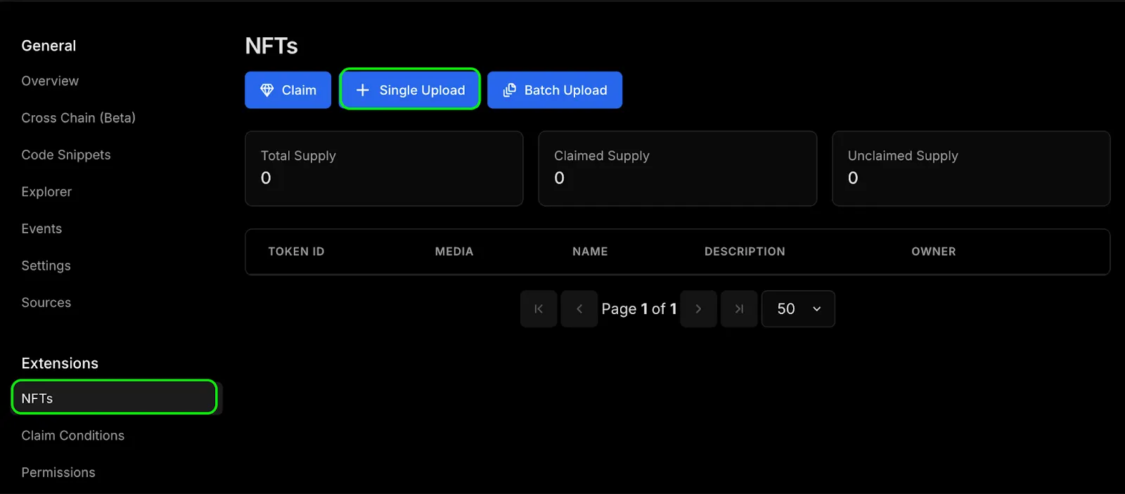 - Once the newly deployed contract dashboard is loaded, navigate to NFT section to lazy-mint new tokens by clicking the Single Upload button