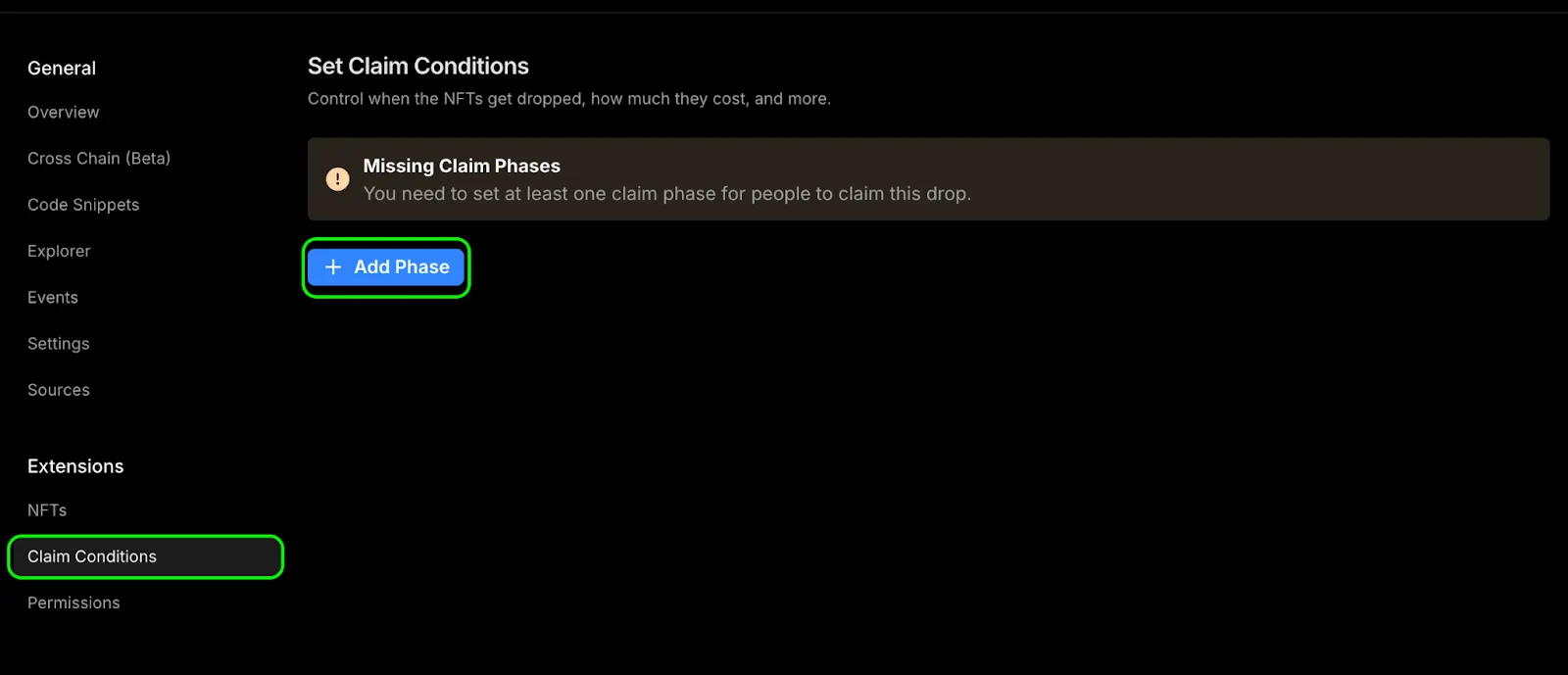 - Navigate to the Claim Condition section under the extension tab and click the Add Phase button