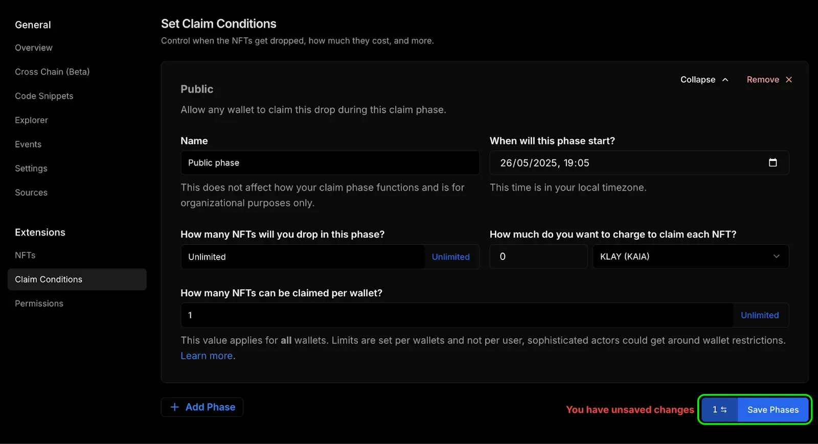 Next is to set the claim condition for the newly minted NFT so that game players can easily claim. To set the claim condition, do the following: