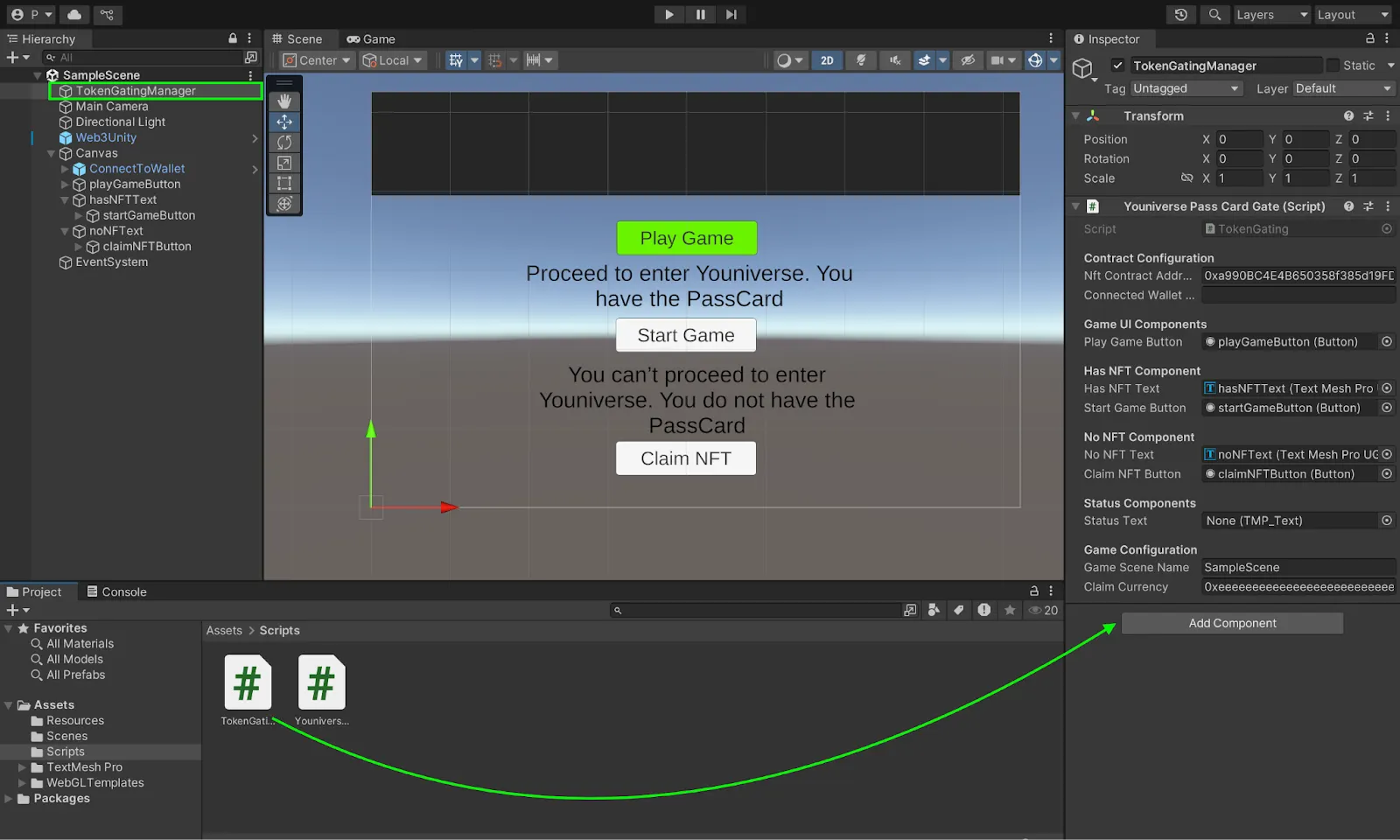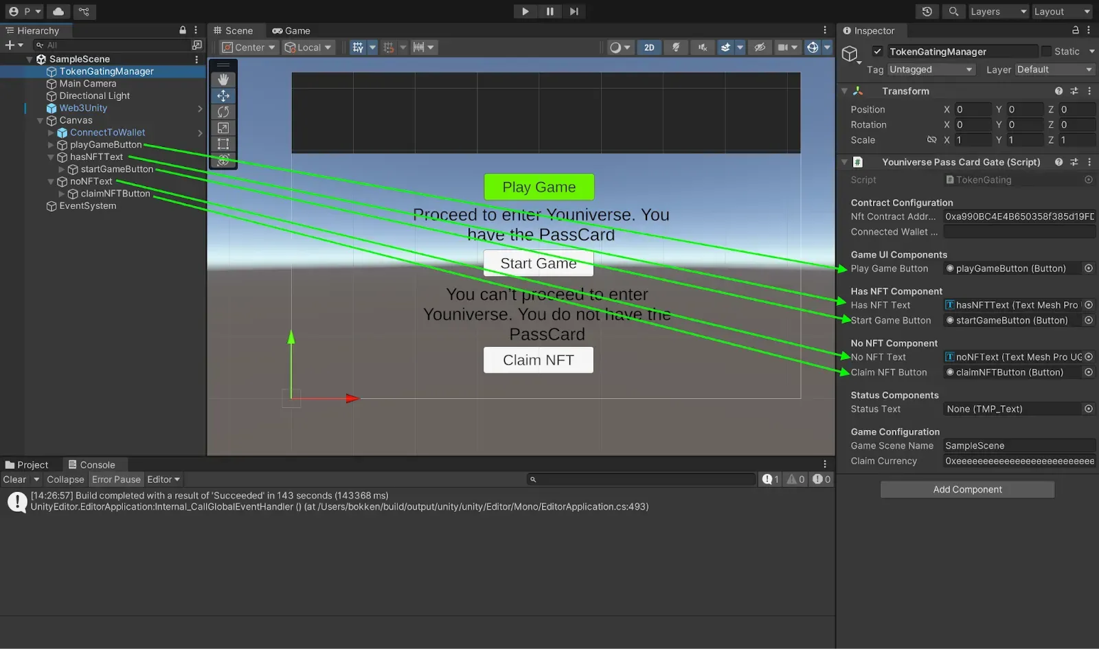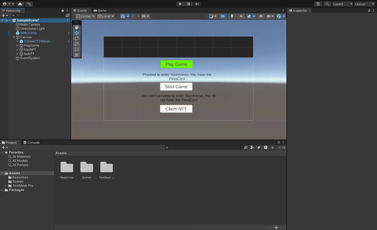 - Make sure to fill the text object with the text you want the player to see if verified to have a PassCard NFT. For example “Proceed to enter Youniverse. You have the PassCard”