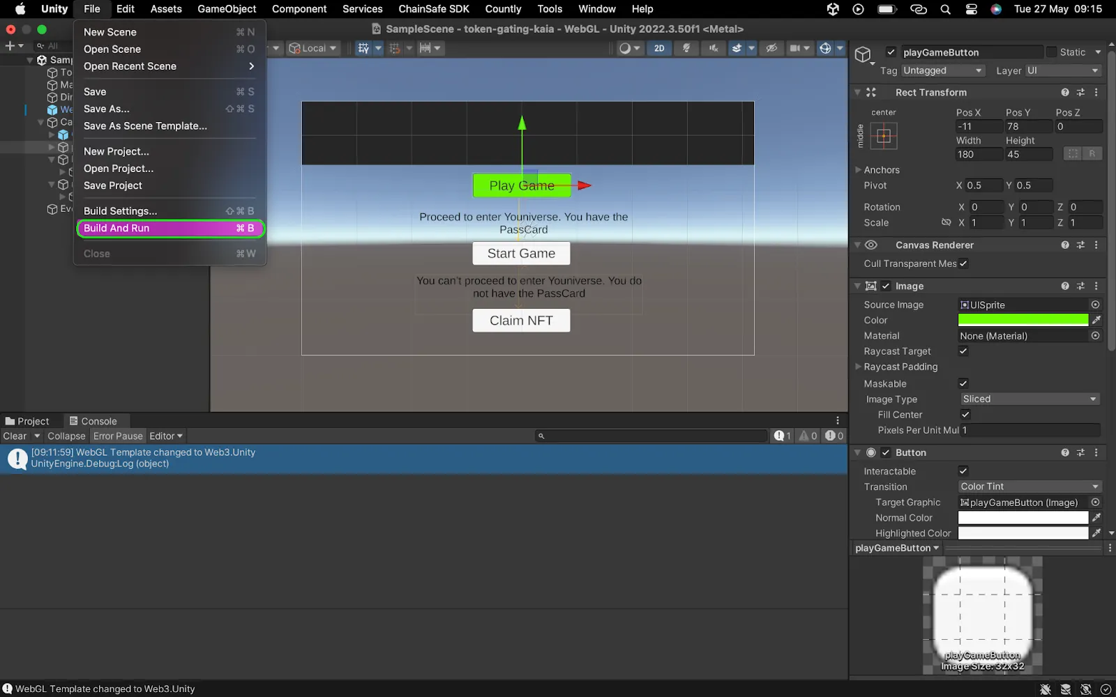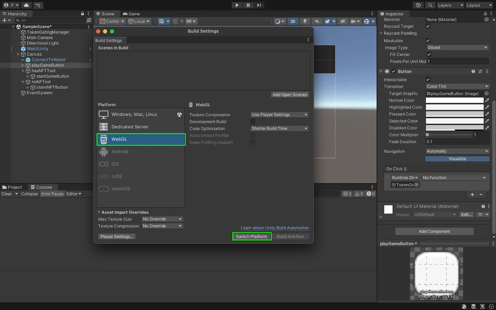 – web3.unity WebGL templates (click Yes) - From the same window, click on Add Open Scenes (top right) to add the SampleScene as the first scene to appear when we run the game.