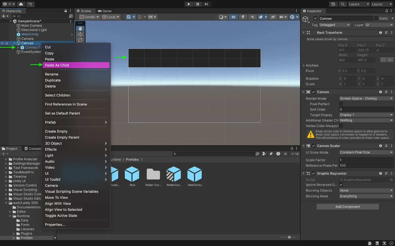 - Copy the ConnectToWallet prefab from Packages > web3.unity SDK > Runtime > Prefabs