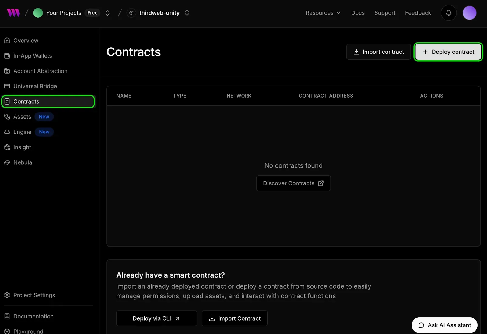 - Navigate to the contracts tab in your created project interface and click the Deploy Contract button