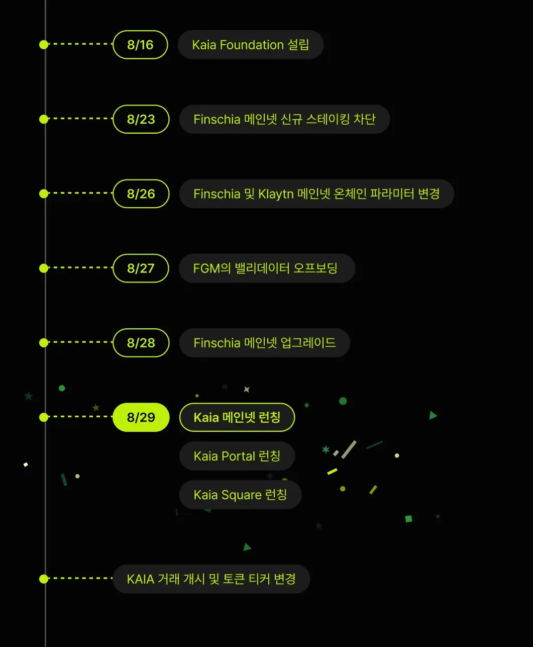 메인넷 출시를 기념하는 이벤트와 경품도 준비되어 있으니, 날짜를 꼭 기억해 주세요. Kaia X를 팔로우하면 가장 빠르게 소식을 만날 수 있습니다. 한편, Kaia 메인넷 런칭 시점 전후로 진행되는 사안들의 개요를 눈에 살펴보겠습니다. 이를 참고하여 기존 Klaytn 및 Fincshia 생태계 참여자들, 그리고 Kaia 생태계에 신규 온보딩하는 구성원들까지 착오 없길 바랍니다.