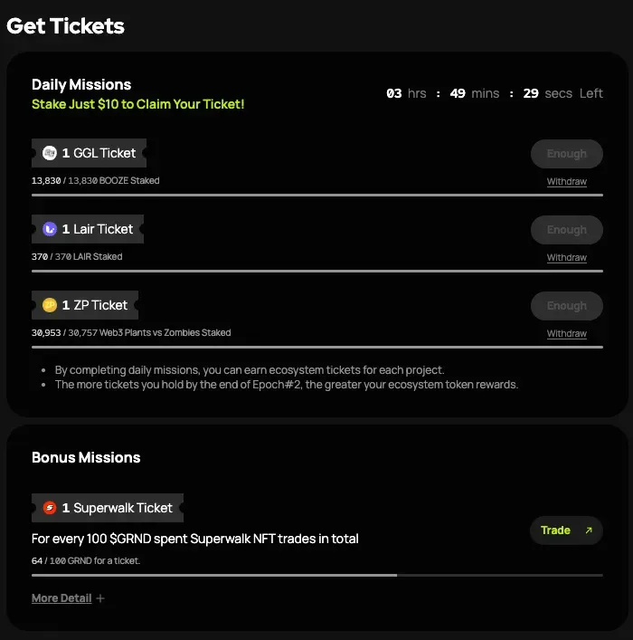 참여 프로젝트의 간단한 미션을 수행하면 에코시스템 티켓을 받을 수 있습니다. 해당 티켓 보유자는 각 프로젝트의 토큰을 확정적으로 분배받습니다.