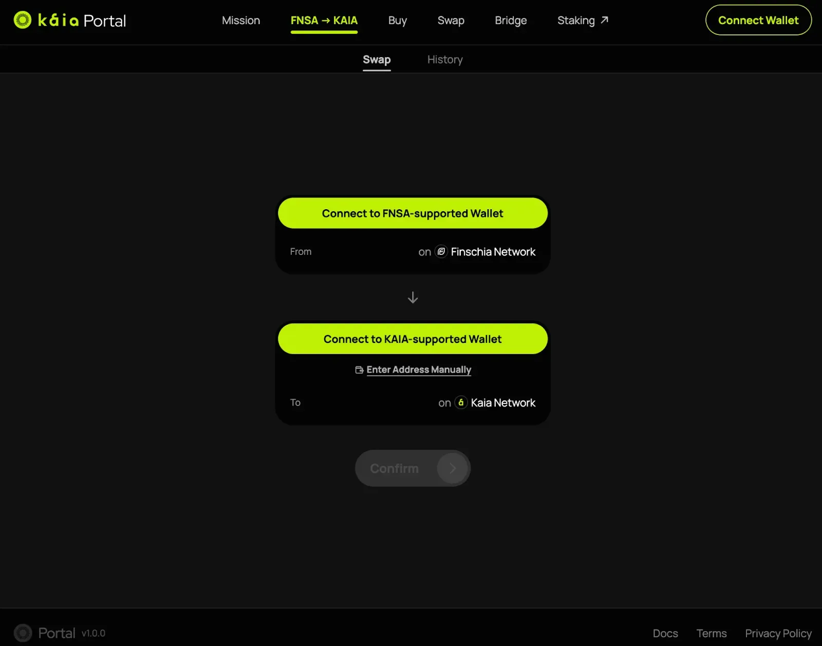 On the “FNSA -> KAIA” tab of the Portal, you’ll be able to connect your existing Finschia and KAIA wallets to convert your FNSA tokens to KAIA. To ensure maximum security during the conversion process, it may take over 30 minutes to complete. During this process, you can monitor the conversion status in real-time under the “History” tab. For more information, please refer to the FNSA > KAIA Swap and FNSA On-chain Contribution Rewards Guide link.