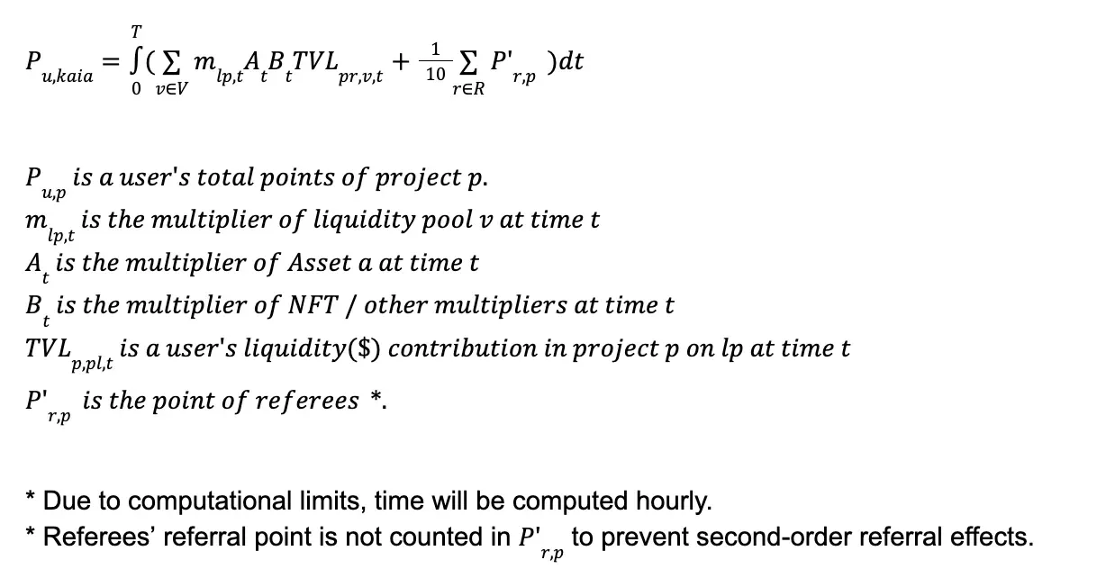 - Kaia point = Liquidity pool (DEX, Lending) multiplier * Asset boosting multiplier * other boosting multiplier * user’s liquidity contribution (user’s TVL) * Time + Referral points