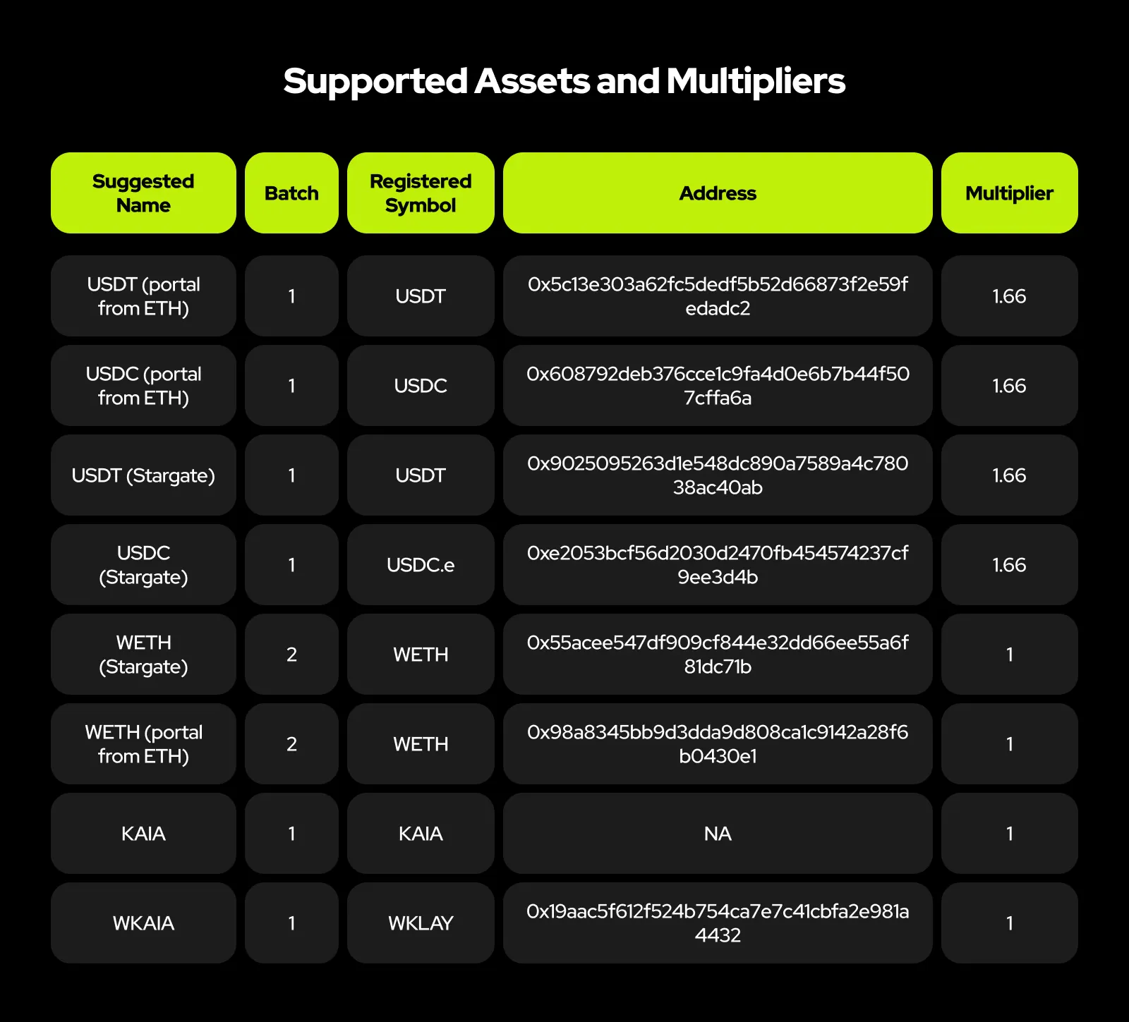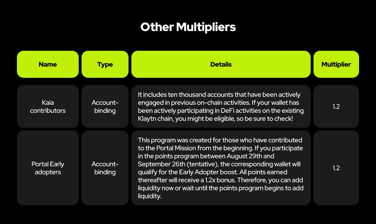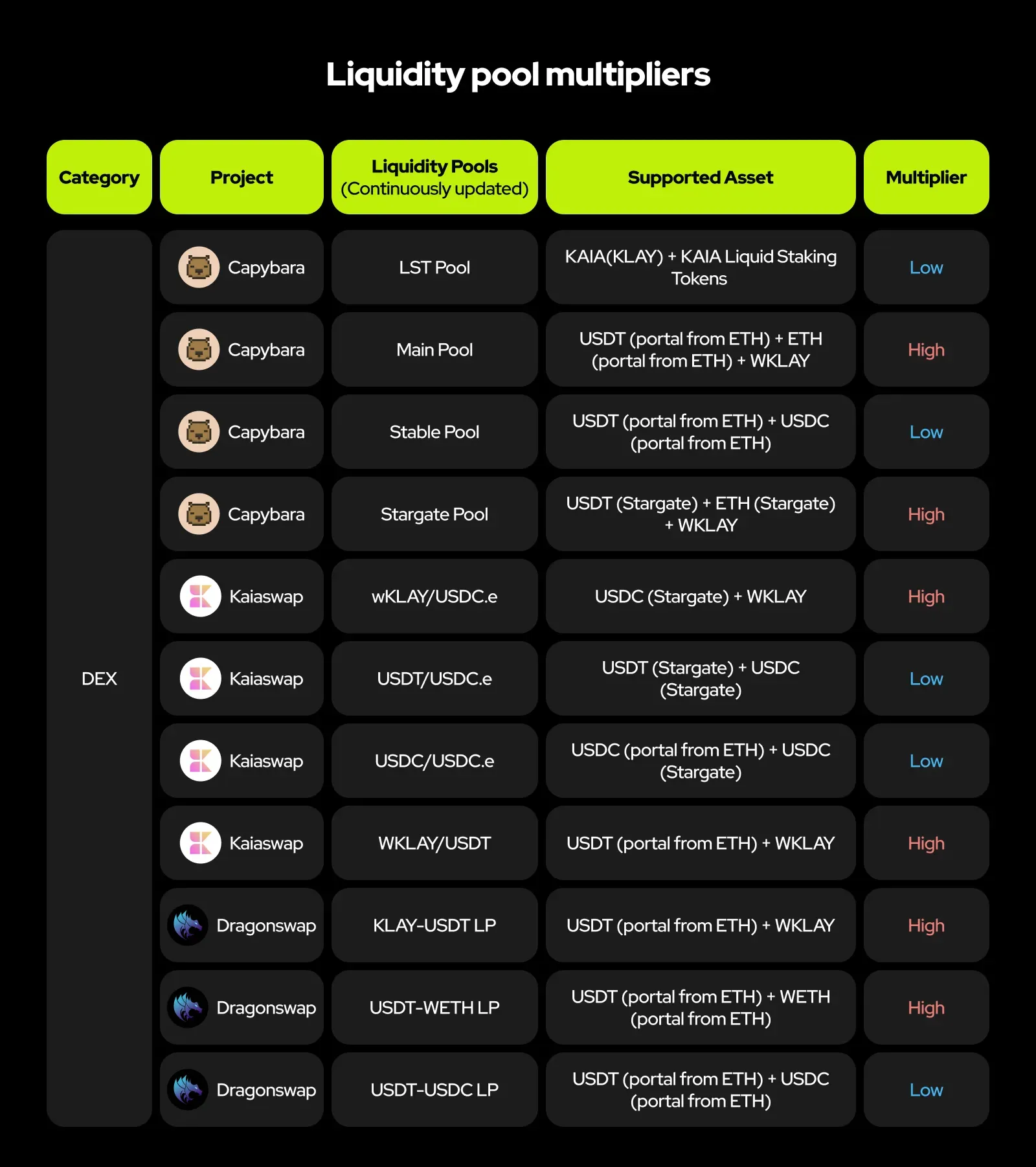 Different risk levels associated with each DeFi’s characteristics are accounted for in the reward multipliers. For example, a USDT-USDC pair pool in a Decentralized Exchange (DEX) has very low volatility due to the stability of the assets, thus lower risk and lower reward multipliers. Conversely, a KAIA-USDT pool has higher risk due to KAIA’s price volatility, warranting higher reward multipliers. These multipliers are set based on thorough research of existing Kaia and other chains’ DeFi APR data but may be adjusted for optimization during the campaign.