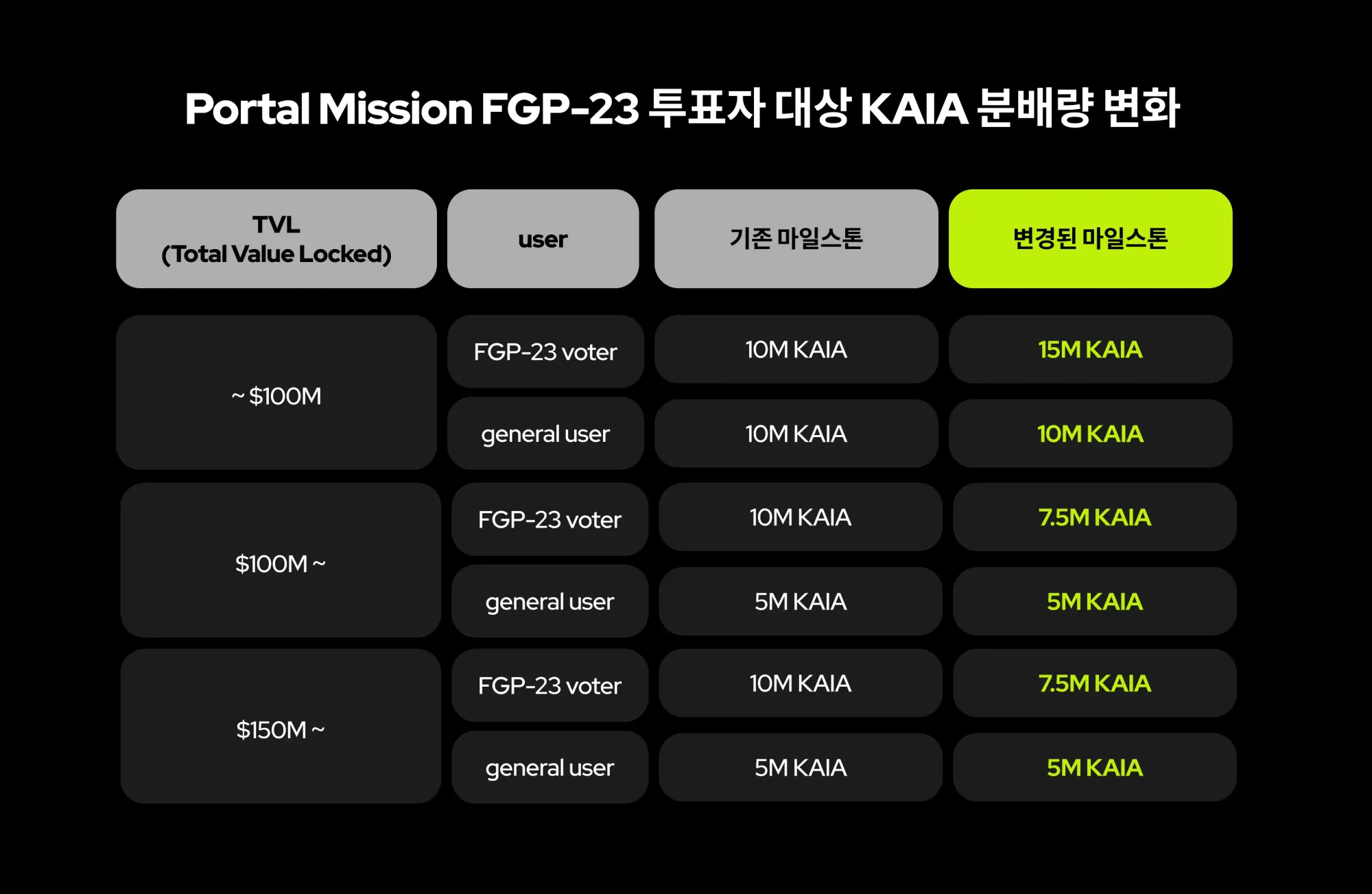 한편, FGP-23 투표자의 Portal 미션 참여율이 예상보다 높았습니다. 이에 APR 이율 등에 있어 공정한 환경을 보장하기 위해 마일스톤별 KAIA 분배량을 일부 조정하였습니다.