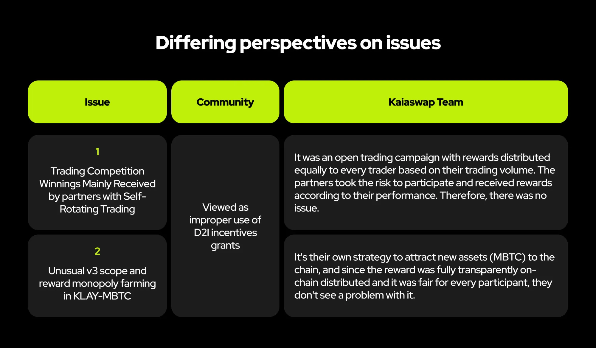 The Foundation believes that, given the operating agreement, there was insufficient basis to conclude that the Kaiswap team’s campaign design was problematic while it seemed not to be beneficial to the greatest extent for Kaia communities. We do recognize that more specific operating agreement clauses are needed for future grants to the ecosystem. We will improve this further.