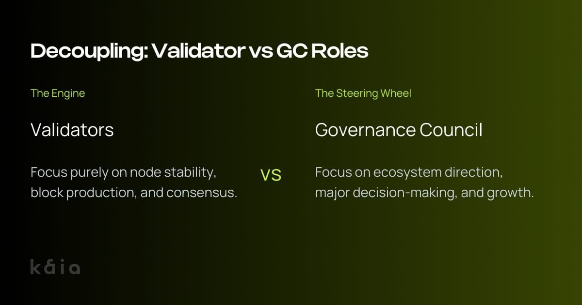 - Decoupling: The roles of Validator (Network Operation) and Governance Council (Decision Making) are now structurally separated.