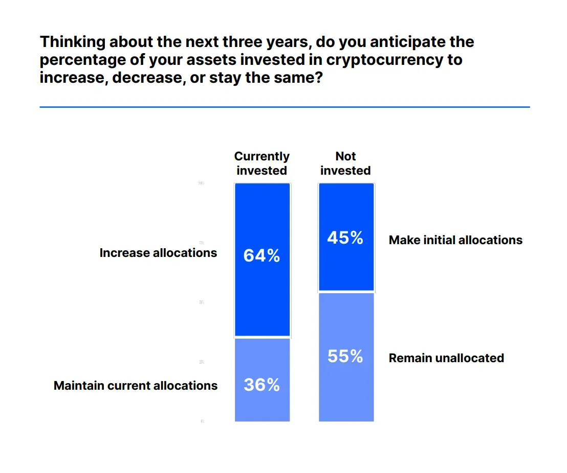 Beyond these ETF products, institutional investors are increasingly interested in cryptocurrencies as a whole. According to Coinbase’s latest survey (November 2023), 45% of institutional investors believe they will increase their allocation to cryptocurrencies in the next three years, and 57% believe the price of cryptocurrencies will increase in the next 12 months — a stark contrast to the signals from the 2022 survey, when only 8% of institutional investors were positive about cryptocurrencies. Beyond cryptocurrencies as an investment, respondents are generally also optimistic about blockchain’s ability to disrupt traditional payments and trade payments markets.